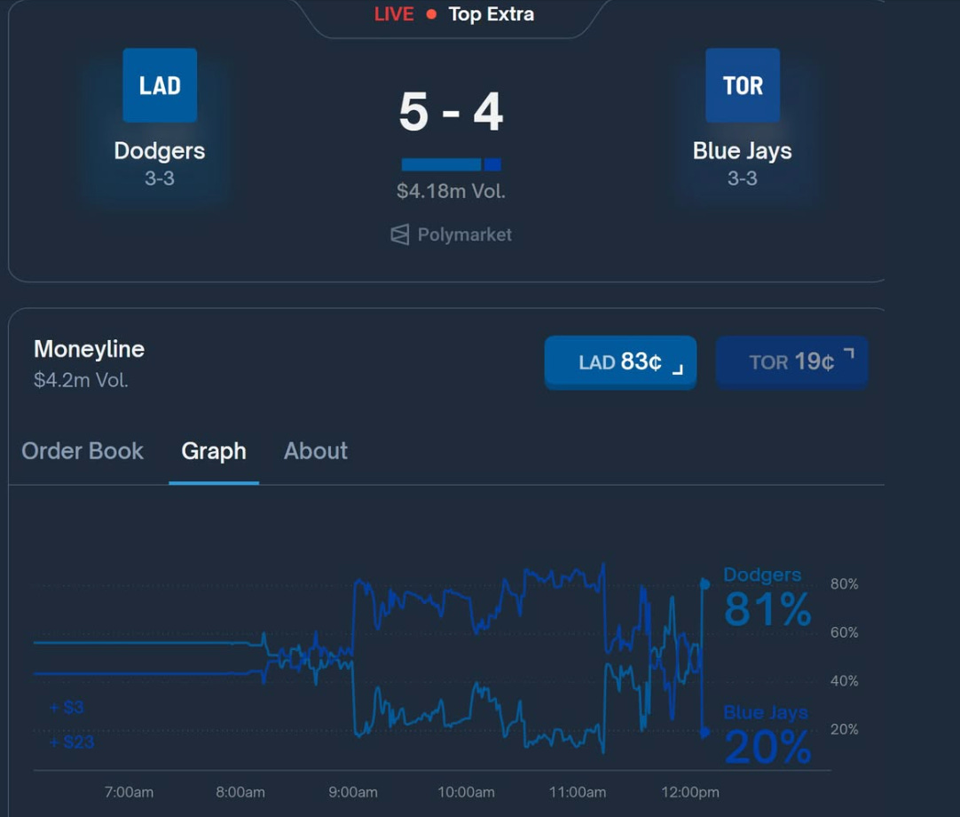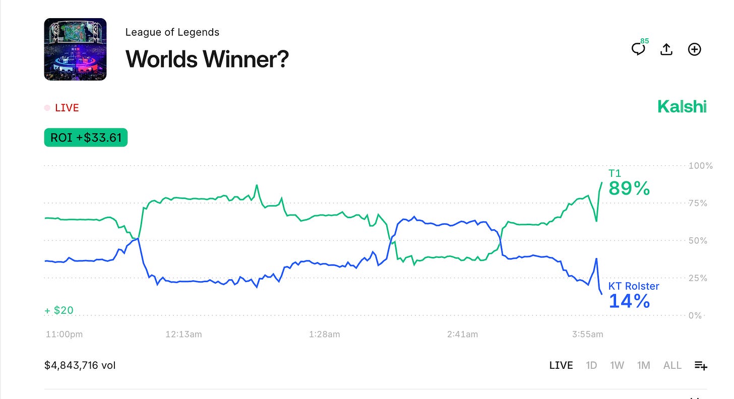 上個禮拜有兩場世界大戰都打到最後一盤,能夠場中即時交易的 Polymarket/Kalshi 讓觀賽體驗變得異常緊張:棒球來說,全壘打追平分,兩邊都滿壘沒得分,最後陽春全壘打領先,再見雙殺打結束。我相信,所有有看的人都會記得如此精彩的總冠軍賽最後一場。LOL:T1 2比1落後,藍方 Faker 選冰鳥艾妮維亞打 BDD 蛇女卡莎碧雅,用版本毒藥冰鳥打出一場不可置信的戰場切割拉扯,取得 2:2 平手以後,第五場再次上演「絕境李相赫」,完成3連霸冠軍。