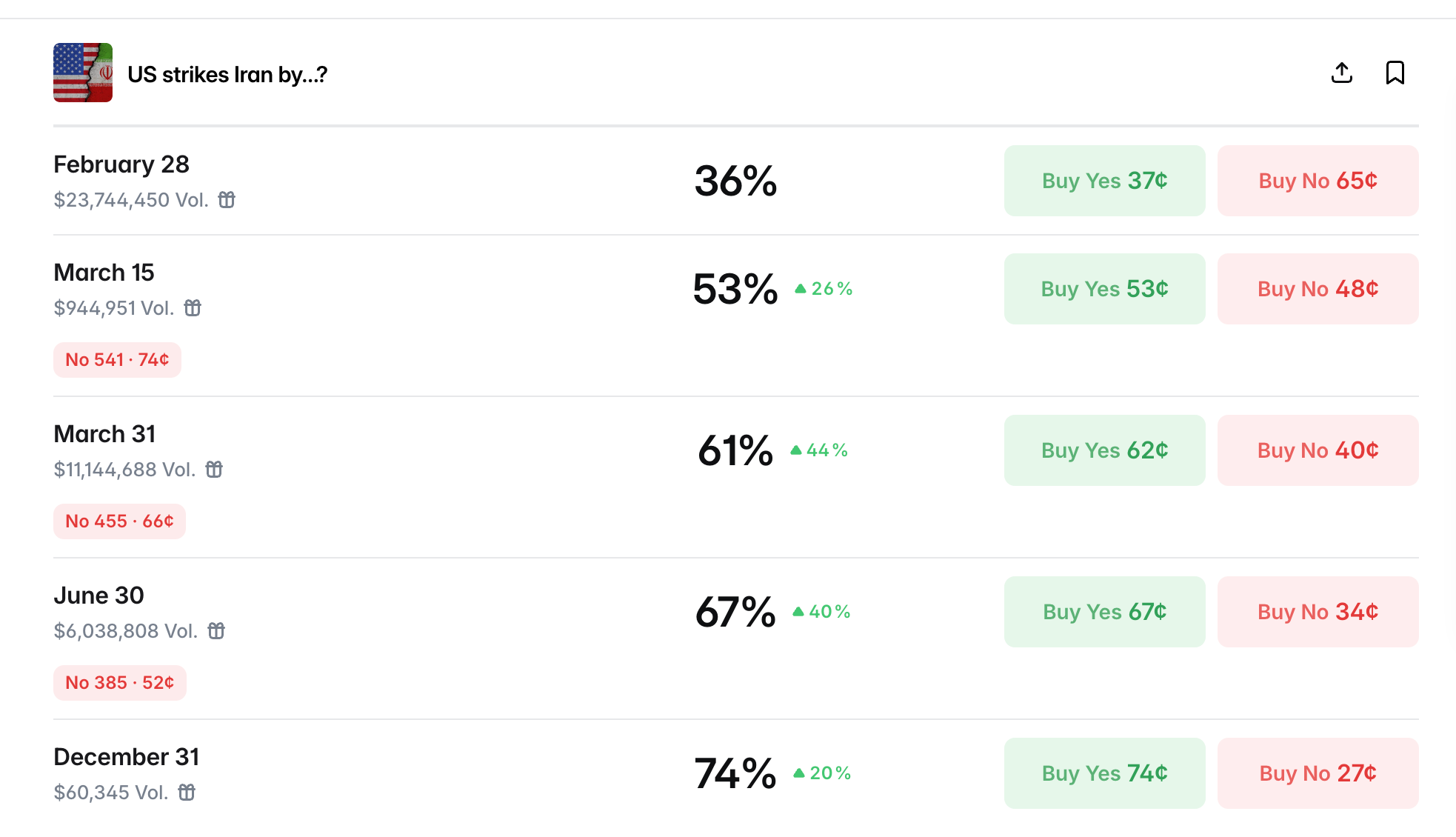同一天,Polymarket 上「US strikes Iran by...?」的 YES 定價是 36%。交易量超過 2300 萬 USD。