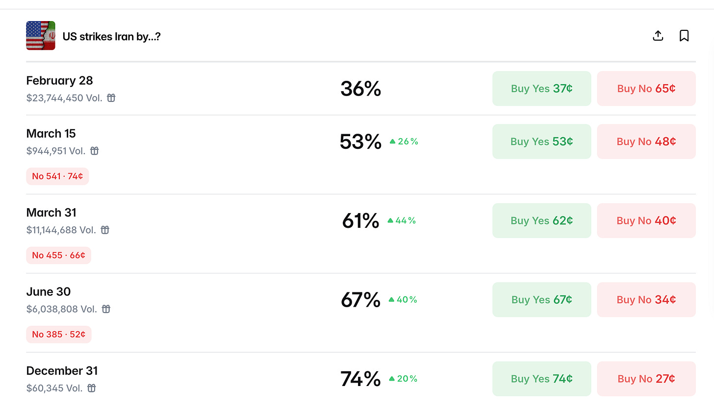 但是以上每一條「不會打」的理由,都有一個致命的反駁——這次的情境跟過去所有先例都不同。過去伊朗沒有屠殺三萬自己的人民。過去伊朗沒有在被美以聯合轟炸後還在重建核設施。過去海峽沒有被部分關閉過。過去沒有兩艘航母同時在阿拉伯海。我的直覺說不會打,但我的直覺已經不像一週前那麼值錢了。白宮說 90%,Polymarket 說 36%。一邊是決策圈的人在放風,另一邊是用真錢下注的人在對賭。如果 Maduro 那次有人提前知道答案,這次 1.75 億美元的交易量裡,有多少人已經知道了?